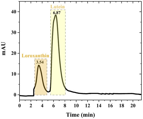 The concentration of loroxanthin and lutein in the carotenoid extract was measured by diluting it with a mobile phase consisting of methanol, methyl-tert-butyl ether, and water in a ratio of 70:25:5. Subsequently, 20 μL of the diluted extract was injected into an HPLC system (1260 Series, Agilent, Santa Clara, CA, USA) equipped with a diode array detector. The carotenoid extract was separated using a Waters YMC-C30 Carotenoid column (4.6 mm ID × 250 mm, 5 μm) at a flow rate of 1.0 mL/min and a temperature of 25 °C. The elution was monitored at wavelengths of 450 nm and 446 nm, which correspond to the maximum absorbance for loroxanthin and lutein, respectively. A gradient mobile phase system including methanol: methyl-tert-butyl ether: water was employed, as per prior research [,]. Based on the previous work, the percentage of water was added to methanol. To prepare a stock solution of lutein with a concentration of 100.0 mg/L, 1.0 mg of lutein was measured and dissolved in 10.0 mL of chloroform, which was stabilized with 1% ethanol. The quantification of loroxanthin (19-hydroxy lutein) and lutein was performed using High-Performance Liquid Chromatography with Diode Array Detection (HPLC–DAD). This was carried out by employing the external standard approach, where standard curves of a reference lutein standard were constructed. As there was no commercial loroxanthin standard available, the quantification of loroxanthin was performed using the standard curves of lutein, as both compounds have comparable structure and absorption spectra.