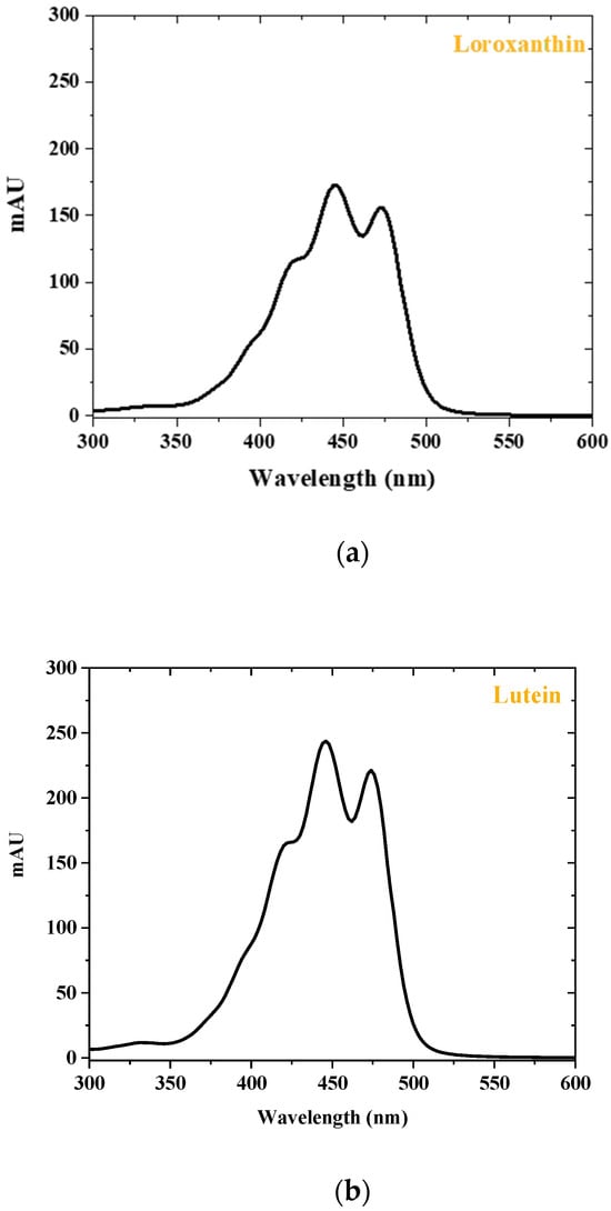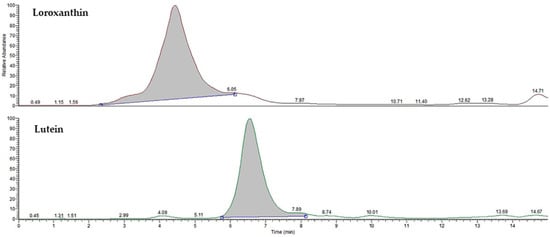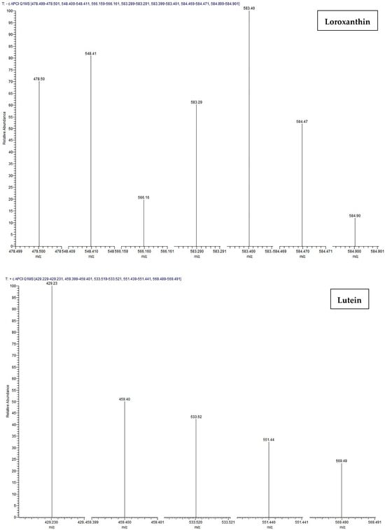 The LC–MS/MS system (Thermo Scientific/TSQ Quantum Access Max) with an atmospheric pressure chemical ionization (APCI) source was used to analyze and identify loroxanthin and lutein. The extract was fractionated using a C30 analytical column (4.6 mm inner diameter × 25 cm length, 5 μm particle size, YMC, Waters) at a temperature of 25 °C. The mass spectrometer was utilized in full scan mode, covering a range of m/z 50–900, with a vaporization temperature of 350 °C. The volume of the injection was 20 μL and the flow rate was 1.0 mL per minute. The mobile phase comprised methanol (A), an aqueous solution containing 0.1% formic acid (B), and tert-butyl methyl ether (C). The gradient elution was conducted according to the following protocol: from 0 to 5 min, a linear increase from 5% B to 25% C; from 5 to 10 min, a linear decrease from 5% B to 0% B and an increase from 35% C to 55% C; from 10 to 15 min, a constant concentration of 100% B; and a linear decrease from 0% B to 0% B and an increase from 55% C to 75% C. The mass spectra were obtained using positive ion mode, with a detection voltage of 1.5 kV and an APCI temperature of 350 °C. The identification of carotenoids was achieved through the comparison of their retention periods and mass spectra with those of reference standards and the mass spectra published in the literature [,,].