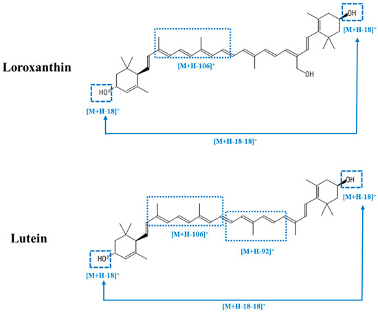 LC–MS/MS spectra of isolated loroxanthin and lutein and their possible fragmentation pathways.
