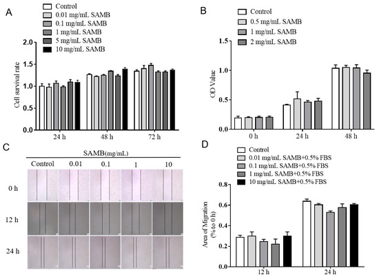 As shown in Figure 1A, the Cell Counting Kit-8 (CCK-8) assay demonstrated that SAMB (0.01, 0.1, 1, 5, and 10 mg/mL) did not exhibit significant cytotoxicity towards HUVECs, as well as measuring the cell proliferation and migration rates of HUVECs (Figure 1B–D). Endothelial proliferation and migration are pivotal processes involved in inflammation [35]. Thus, these findings indicate that SAMB does not influence inflammation by affecting the basic functions of ECs.