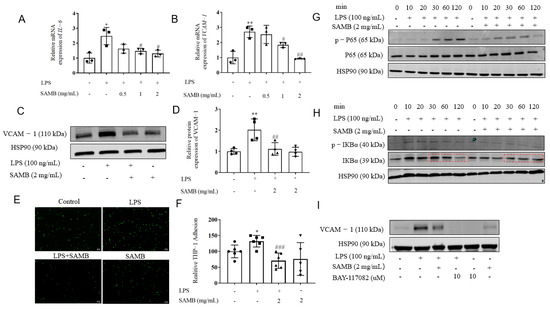 Figure 2. SAMB inhibited inflammation and monocyte adhesion induced by LPS in HUVECs: (AC) HUVECs were pretreated with different concentrations of SAMB (0.5, 1, 2 mg/mL) for 24 h and then stimulated with LPS (100 ng/mL) for 6 h (n = 3). The mRNA expression of (A) Vcam-1 and (B) Il-6; (C) Western blotting of VCAM-1 in HUVECs; (D) quantitation analysis of protein expression of VCAM-1 (n = 4); (E,F) representative images and quantification of the adhesion of THP-1 to HUVECs observed under a fluorescence microscope (×100), n = 5–6; (G) Western blotting of p-p65 and p65 in HUVECs; (H) Western blotting of p-IκBα and IκBα in HUVECs; (I) the protein expression of VCAM-1 caused by stimulating HUVECs with BAY-117082 for 1 h and then 100 ng/mL LPS for 24 h. Data are shown as the mean ± SD; * p < 0.05, ** p < 0.01 vs. control group; # p < 0.05, ## p < 0.01, ### p < 0.001 vs. LPS+SAMB group.