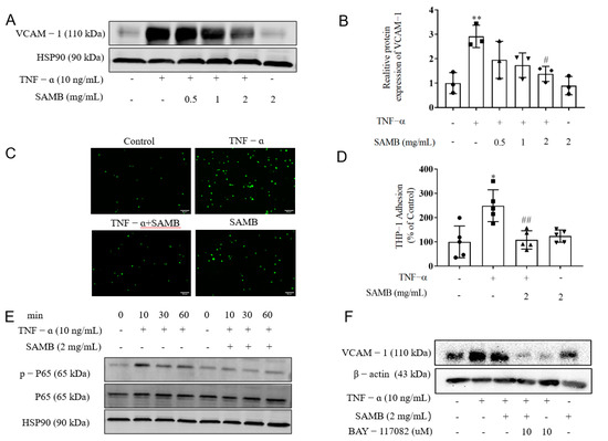 Figure 3. SAMB inhibited VCAM-1 expression and monocyte adhesion induced by TNF-α in HUVECs: (A) Western blotting of VCAM-1 in HUVECs after their stimulation with TNF-α (10 ng/mL). (B) Quantitation analysis of protein expression of VCAM-1 (n = 3). (C,D) Representative images and quantification of the adhesion of THP-1 cells to HUVECs, observed under a fluorescence microscope. (×200). (E) Western blotting of p-p65 and p65 in HUVECs. (F) The relative quantitation of the protein levels in HUVECs. (F) The protein expression of VCAM-1 in HUVECs stimulated with BAY-117082 for 1 h and then 10 ng/mL TNF-α for 24 h. Data are shown as the mean ± SD; * p < 0.05, ** p < 0.01 vs. control group; # p < 0.05, ## p < 0.01 vs. LPS+SAMB group.