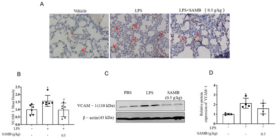 Figure 5. Effects of SAMB on VCAM-1 expression in ALI mice’s lung tissue: (A) Representative immunohistochemical images of VCAM-1 in lung tissue (×200). (B) Immunohistochemical detection of VCAM-1 expression in mouse lung tissues (n = 6). (C) Western blotting of VCAM-1 in mouse lung tissues. (D) Quantitation analysis of protein expression of VCAM-1 (n = 4). Data are shown as the mean ± SD; * p < 0.05 vs. normal group; # p < 0.05 vs. LPS+SAMB group.