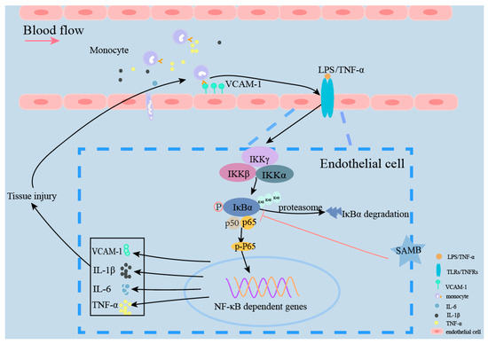 This study aimed to investigate the potential anti-inflammatory effects of SAMB on ECs both in vitro and in vivo (schematic summary shown in Figure 6). The induction of inflammation in HUVECs in vitro was achieved by employing exogenous PAMPs (LPS) or endogenous inflammatory mediators (TNF-α). The findings demonstrated that SAMB significantly reduced monocytes’ adhesion to HUVECs in both models through the downregulation of VCAM-1 expression. Further mechanistic investigations revealed that SAMB inhibited IκBα degradation, thereby suppressing the NF-κB p65 phosphorylation and NF-κB-dependent expression of pro-inflammatory cytokines, including IL-6, IL-1β, and TNF-α, as well as the adhesion molecule VCAM-1 [42]. The critical role of endothelial inflammation in ALI has been demonstrated by numerous studies [43]. Therefore, we established a murine model of septic ALI by intraperitoneal administration of LPS to substantiate SAMB’s in vivo anti-inflammatory and endothelial protection effects [40]. The results demonstrated that SAMB effectively mitigated lung injury by reducing the levels of inflammatory factors in both lung tissues and sera and attenuating the expression of VCAM-1 in lung tissue. Our findings offer valuable insights into the potential application of SAMB in treating ALI, emphasizing the imperative for clinical evaluation of its efficacy in mitigating endothelial-inflammation-related diseases.