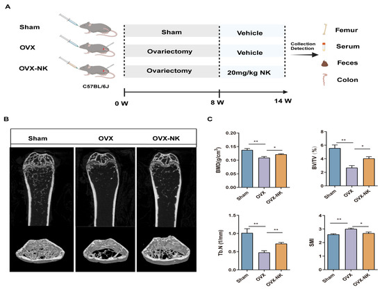 Effect of nodakenin on femoral bone microarchitecture in OVX mice. (A) Schematic diagram of in vivo experiments. (B) Micro-CT scanning representative image. (C) Statistics of bone morphometric parameters, bone mineral density (BMD), bone volume fraction (BV/TV), number of bone trabeculae (Tb.N), and structural modeling index (SMI). Mean ± SEM (n = 6). * p < 0.05; ** p < 0.01.