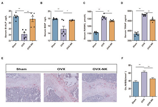 In order to evaluate the impact of nodakenin on osteoporosis, we examined the changes in serum bone turnover marker levels via ELISA. The serum levels of the B-ALP and BGP bone formation markers were significantly elevated in nodakenin-treated mice compared to OVX mice, while TRAP and RANKL bone resorption markers were decreased (Figure 2A–D). In addition, we used TRAP staining to assess the femoral histomorphometry in order to investigate the impact of nodakenin on estrogen shortage-induced bone loss. The findings demonstrated that a decrease in estrogen levels led to a notable rise in osteoclasts, while nodakenin exhibited the ability to impede osteoclastogenesis in mice (Figure 2E,F).