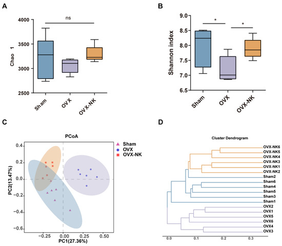 Clustering and diversity analysis of gut microbiota in different groups of mice. Changes in fecal α-diversity of gut microorganisms: Chao 1 estimator (A) and Shannon index (B). (C) Plot-based UniFrac PCoA. (D) Cluster analysis of gut microbiota among samples. Mean ± SEM (n = 6). * p < 0.05, ns means no significant difference.