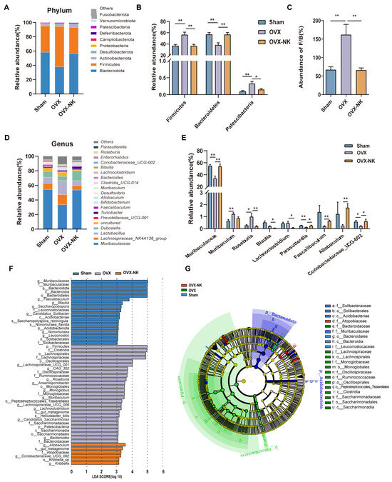 Relative abundance analysis of the gut microbiota at the multispecies level for different groups. (A) Composition of gut microbiota at the phylum level. (B) Gut microbiota are significantly different at the phylum level. (C) Abundance ratio of F/B. (D) Composition of gut microbiota at the phylum level. (E) Gut microbiota significantly differ at the genus level. (F) Histogram of the distribution of LDA values. (G) Evolutionary branching diagram of LEfSe analysis. Mean ± SEM (n = 6). * p < 0.05; ** p < 0.01.