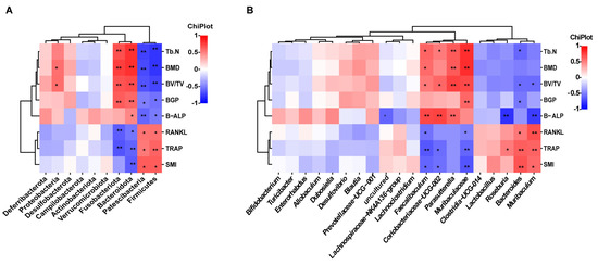 Analysis of correlations between gut microbiota and bone turnover indicators. (A) Heat map of Spearman’s r correlation between gut microbiota and bone biological parameters at the phylum level. (B) Heat map of Spearman’s r correlation between gut microbiota and bone biological parameters at the genus level.* p < 0.05; ** p < 0.01.