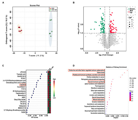 Alterations in the composition of gut microbes can result in changes in intestinal metabolites. To further explore the effect of nodakenin on intestinal metabolites, an untargeted metabolomic analysis of feces was performed using LC-MS. The PLS-DA analysis showed that the sample points in the OVX and OVX-NK groups did not overlap at all. This means that the mixtures of metabolites were very different (Figure 6A). The variable significances of VIP > 1 and p < 0.05 were used to screen for differential metabolites between the two groups. Out of a total of 2080 metabolites, 113 showed significant differences. Among them, 48 exhibited considerably higher relative levels, while 65 had significantly lower relative levels (Figure 6B). The top 20 differential metabolites with VIP values were selected for presentation, including LPG 22:6, traumatic acid, and calcitriol (Figure 6C). Notably, the group that was administered nodakenin had much higher levels of calcitriol, a metabolite that helps bones form (Figure 6C). Further metabolite enrichment analysis showed that nodakenin treatment had significant effects on multiple metabolic pathways, involving endocrine and other factor-regulated calcium reabsorption, tuberculosis, retrograde endocannabinoid signaling, alpha-Linolenic acid metabolism, thermogenesis, riboflavin metabolism, ether lipid metabolism, mineral absorption, etc., (Figure 6D).