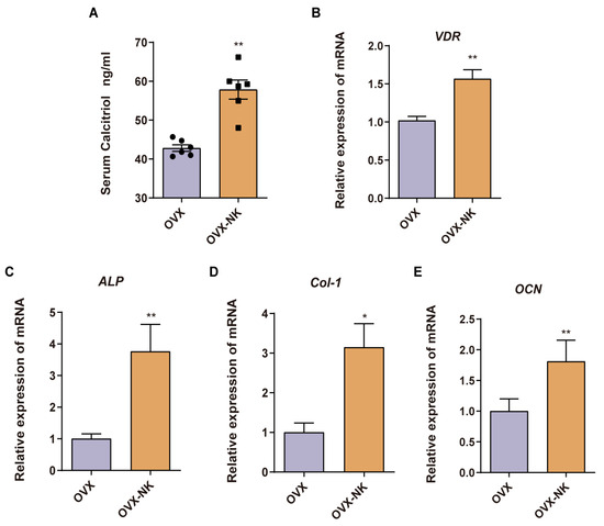 Nodakenin prevents OP by accumulating calcitriol. (A) ELISA detection of calcitriol in mice serum. (B–E) qRT-PCR was performed to determine the levels of VDR, ALP, Col-1 and OCN mRNA expression. mean ± sem (n = 6). * p < 0.05, ** p < 0.01.
