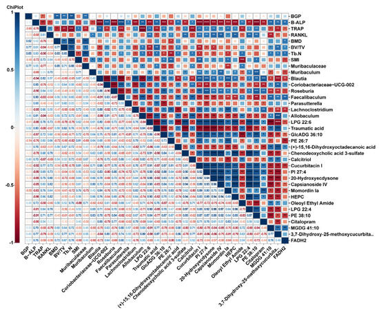 In addition, Spearman correlation analysis was performed on intestinal metabolites (VIP top 20), significantly different gut microbiota, and osteoporosis indicators (Figure 8). We discovered substantial associations among the aforementioned metrics, indicating that the beneficial impact of nodakenin on bone loss in mice produced by OVX involves the regulation and recovery of gut microbiota and metabolite profiles. Nevertheless, additional verification is required to establish the potential pathways that influence the gut microbiota and metabolites in OP therapy.