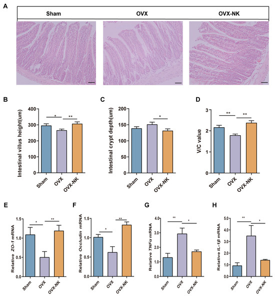 Nodakenin ameliorates intestinal barrier impairment in OVX mice. (A) Representative images of hematoxylin and eosin staining. Scale bars are 100 μm. (B–D) Image J measured the height of small intestinal villi and depth of crypts and analyzed the V/C ratio. (E–H) qRT-PCR was performed to determine the levels of Occludin, ZO-1, IL-1β and TNFα mRNA expression. mean ± sem (n = 6). * p < 0.05, ** p < 0.01.