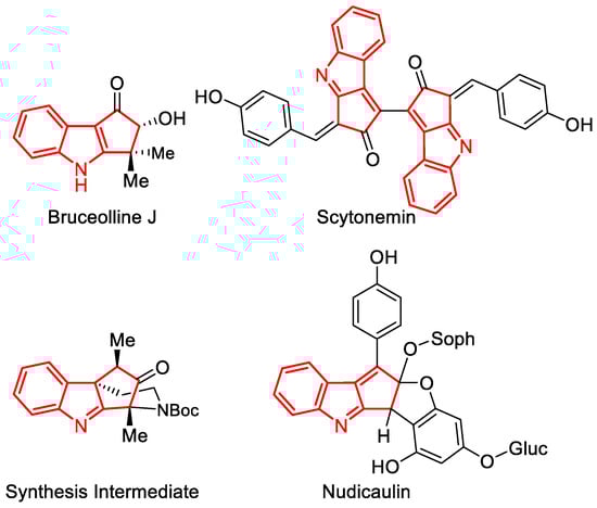 Cyclopenta[b]indoles, as privileged heterocyclic skeletons, are present in numerous natural alkaloids and pharmaceuticals possessing a wide range of biological activities [1,2,3,4,5,6,7,8]. Accordingly, bruceollines are traditionally used to treat parasitic diseases and malaria [5,6]. Scytonemin is a small-molecule inhibitor of polo-like kinase and has the potential to inhibit other cell cycle regulators (Figure 1) [8]. Additionally, this type of fused tricyclic structure has been used as an intermediate in pharmaceutical chemistry and in the total synthesis of natural products, such as arborisidine and 19-epi-arborisidine [9]. Owing to their important biological properties, various synthetic protocols have been developed for preparing cyclopenta[b]indoles. Among these protocols, the (3+2) annulation of 2-indolylmethanols and olefins is an atom-economic strategy for the synthesis of these fused indole derivatives [10,11,12,13,14,15,16,17,18]. In recent years, 2-indolylmethanols have become intriguing reactants because of their unique properties of electrophilicity and nucleophilicity at the C3 position [19,20,21,22,23,24,25,26,27,28]. Despite these impressive achievements, a more efficient and diversity-oriented approach for cyclopenta[b]indoles is still required.