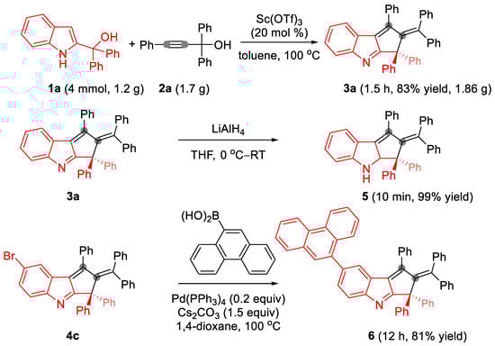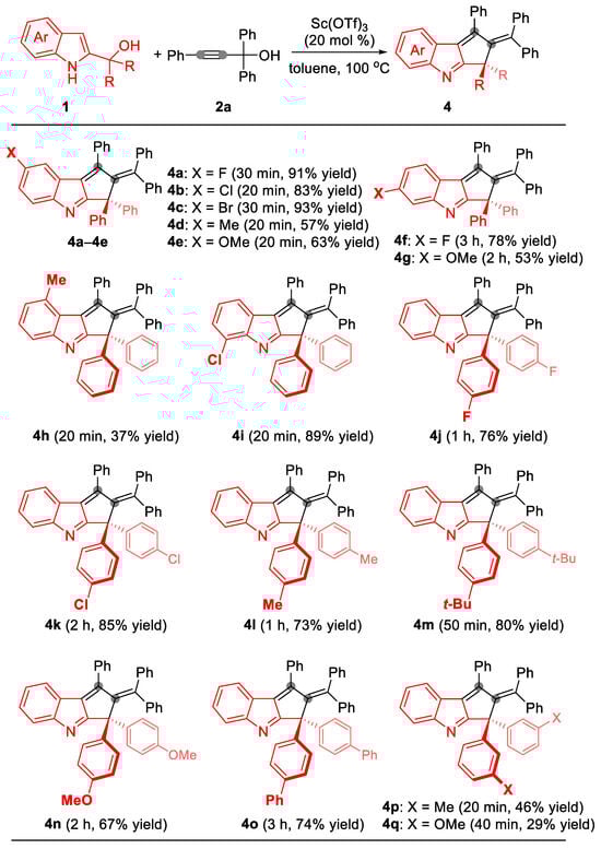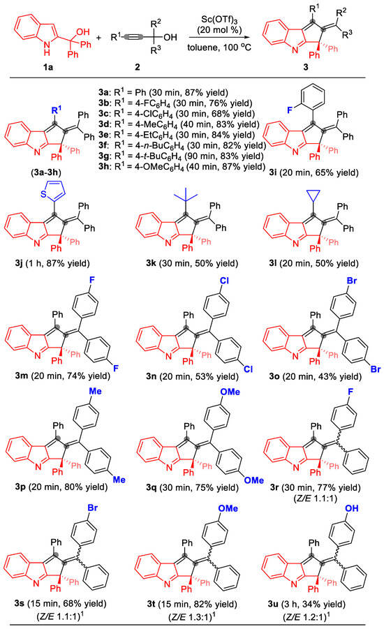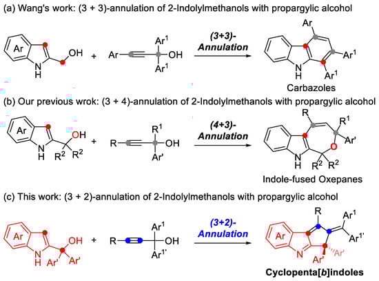 Propargylic alcohols have shown promise as feedstocks for the synthesis of carbo- and heterocyclic compounds. Recently, a number of studies have specifically focused on Lewis- or Brønsted-acid-catalyzed tandem annulations of propargylic alcohols to construct diversely structured indole derivatives [29,30,31,32,33,34,35]. However, there have been limited studies on the annulations of propargylic alcohols with 2-indolylmethanols. In 2014, Wang [36] reported a Lewis-acid-catalyzed (3+3) annulation of propargylic alcohols and 2-indolylmethanols, providing an effective approach to obtain polysubstituted carbazole derivatives (Scheme 1a). Recently, our group developed a Brønsted-acid-catalyzed (3+4) annulation of 2-indolylmethanols and propargylic alcohols, providing a convenient method to obtain structurally diverse indole-fused oxepines (Scheme 1b) [37]. However, to the best of our knowledge, no method has been reported for the synthesis of 1,2,3-trisubstituted cyclopenta[b]indoles by formal (3+2) annulation between 2-indolylmethanols and propargylic alcohols. With our continuing research interest in propargylic alcohols [38,39,40,41] and the importance of cyclopenta[b]indoles, herein, we describe a Sc(OTf)3-catalyzed (3+2) annulation of 2-indolylmethanols with propargylic alcohols to synthesize cyclopenta[b]indoles (Scheme 1c).
