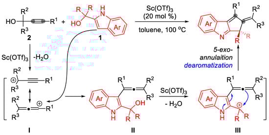 A plausible mechanism for the reaction is proposed in Scheme 5. First, propargylic alcohol 2 is converted to allene carbocation I under Sc(OTf)3 catalysis. This carbocation then undergoes a Friedel–Crafts-type reaction with indolylmethanol 1 to give the allene intermediate II. This intermediate is transformed to benzylic carbocation III. Intermediate III undergoes 5-exo-annulation to give the final cyclopenta[b]indole product.