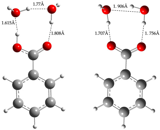 The initial geometry of benzoic acid and benzoate in the presence of 2 explicit water molecules was drawn as close as possible to the final ones, according to the literature [1,3,17]. Geometry optimization of the other target molecules was then performed, starting from the leading compounds and adding the appropriate substituent(s) on the ring. Hence, following our model, for each set of compounds (i.e., the acid and the conjugated base), two water molecules were placed at the reaction center [1,8], as shown in Figure 2.