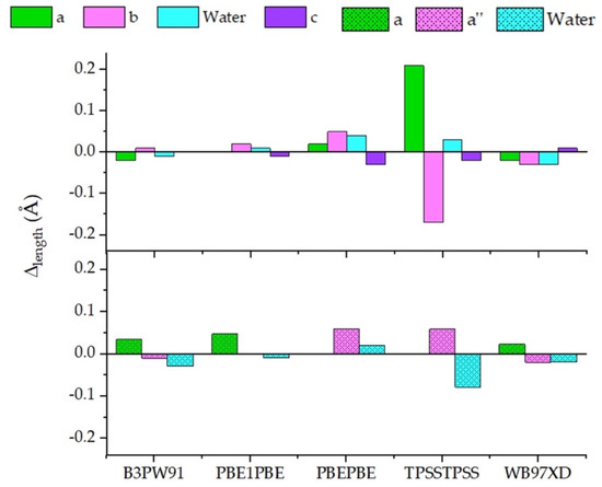Realistic modeling of the shape of the solvation cavity is a major goal in obtaining consistent computed pKa values [8]. Indeed, it was previously demonstrated that coarse models of the first solvation shell could cause huge inaccuracy in determining pKa [5]. Further, several attempts were made in re-shaping the “reaction centre” with encouraging results [1,2,3,4,5,8]. Therefore, to better understand if the difference in pKa values obtained with different functionals could be related with a significant modification of the solvation cavity, an extensive analysis was performed. However, no remarkable discrepancy among CAM-B3LYP and the other functionals was observed in the reaction center geometry, nor in the shape of the overall solvation cavity around the molecules (Figure S2, Supplementary Information). Thus, a punctual estimation of each species involved in the reaction center was performed, through the bond length determination and dihedral evaluation. Due to the trustworthy MAE value [1,8], the bond lengths returned by CAM-B3LYP were considered as the standard ones, assuming its ability to mimic the solvation cage geometry similar to the “real” one. Thus, the differences were referred to its bond values (thereafter Δlength). For each acid species, the distance among the moieties describing the reaction center was considered, as reported in Figure 3.