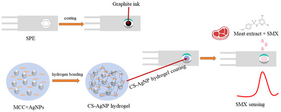 Recent advances in nanotechnology have stimulated interest in utilizing nanomaterials for enhancing the performance of electrochemical sensors. The excellent conductivity, high surface area and catalytic properties of nanomaterials can improve electron transfer kinetics and sensitivity [24]. Cellulose is an abundant biopolymer that has been widely researched for developing functional nanocomposites using metal nanoparticles as nanofillers [25,26]. This study aims to develop a disposable electrochemical sensor using silver nanoparticle-decorated cellulose hydrogel composites. The gel matrix provides a biocompatible microenvironment and stabilizes the nanoparticles within its porous network. Additionally, the hydrogel composite facilitates the diffusion of analyte molecules to the sensor interface for rapid electron exchange reactions. The sensor is applied for sensitive detection of SMX residues in meat samples using voltammetric analysis. The unique composition and surface architecture of the nanocomposite sensor holds promise for enabling rapid, on-site screening of antibiotic contamination to ensure food safety.