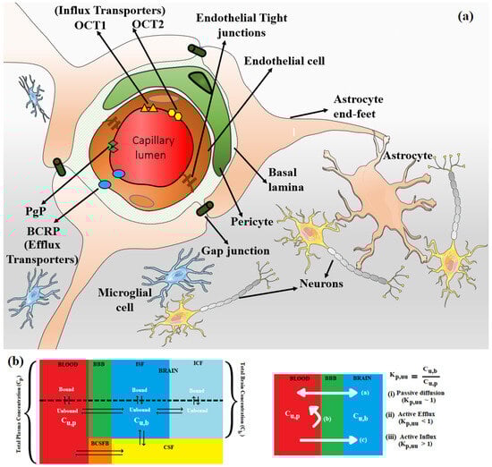 (a) The endothelial tight junctions of the BBB (shown in brown) severely restrict paracellular transport, whereas specialized transporters, e.g., P-gp (green diamond) and BCRP (blue oval) (efflux transporters) and OCT1 (orange triangle) and OCT2 (yellow hexagon) (influx transporters) regulate the transcellular transport of metabolic nutrients and other essential molecules across BBB. Enclosed in the basal lamina, pericyte cells partially surround these BBB endothelial cells. The complex tight cellular network of BBB is further maintained by astrocytes’ end-feet. Astrocytes maintain the cellular link between neurons and microglial cells. The transport across BBB involves concentration gradient-driven passive diffusion and active transport employing various efflux and influx transporters in the endothelial cell membrane. (b) Schematic of plasma and brain compartments presenting different modes of transport across BBB, i.e., passive diffusion and active transport using efflux (e.g., P-gp, BCRP) and influx (e.g., OCT1, OCT2) transporters. Kp,uu represents the unbound brain to unbound plasma drug concentration ratio, where Cu,b and Cu,p represent the unbound drug concentration in the brain and plasma, respectively. Different brain compartments, i.e., Blood, BBB, CSF, BCSFB, ISF, and ICF, correspond to blood, blood–brain barrier, cerebrospinal fluid, blood–cerebrospinal fluid barrier, interstitial fluid, and intracellular fluid, respectively.