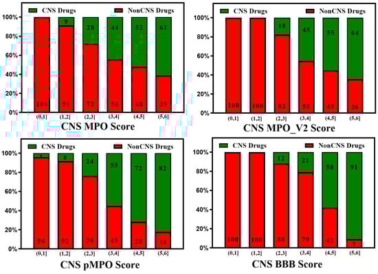 The ease of calculation of the CNS MPO, CNS MPO_V2, CNS pMPO, and CNS BBB scores and their capability to predict the BBB penetration of compounds can aid in mapping the property space of large commercial and virtual compound libraries to support lead optimization. CNS MPO and CNS BBB scores are widely utilized for CNS drug discovery programs. Figure 2 and Figure 3 represent 100% stacked bar graphs for low to high CNS MPO, MPO_V2, pMPO, and BBB scores for a dataset of CNS and non-CNS drugs. Ideally, a CNS MPO, MPO_V2, and BBB score in the range of (4,6] should correlate to a CNS drug, and a CNS MPO, MPO_V2, and BBB score of (0,4] should correspond to a non-CNS drug. pMPO outputs a score in the range of (0,1], which has been scaled to (0,6] to compare against other scores. However, the CNS BBB score performs better in identifying a higher percentage of CNS compounds than other scores.
