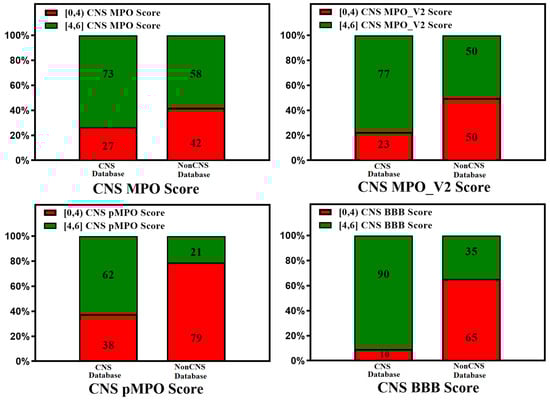 Relative distribution of CNS class of compounds: CNS+ (green) and CNS− (red). The MPO, MPO_V2, pMPO, and BBB scores range from 0 to 6 (a score in the range of [4, 6] means better CNS penetration). Original pMPO scores range between 0 and 1. To be consistent with MPO scores, we scaled the pMPO scores from 0 to 6. Percentage of CNS drugs and non-CNS drugs correctly identified (for CNS: MPO, MPO_V2, pMPO, BBB Score (4, 6]; for non-CNS: MPO, MPO_V2, BBB Scores [0,4)) in their respective CNS and non-CNS database is plotted on 100% stacked bar graph for MPO, MPO_V2, pMPO, and BBB Scores.