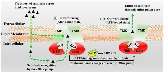 The schematic diagram of the proposed mechanism of P-gp (MDR1) is represented. Transmembrane (TBDs) and nucleotide (NBDs) binding domains of P-gp are presented in green and red, respectively. The P-gp substrates are shown by black triangles, which cross the BBB membrane by passive diffusion or active transport. The inward-facing, ADP-bound state structure (i) changes conformation, the NBDs dimerize, and the TMDs re-orientate to extracellular space to adopt an outward-facing (ATP-bound) state (ii). The extracellular segment’s transmembrane helices in the outward-facing conformation of P-gp reorient to release the substrate. Upon ATP hydrolysis, the transporter is reoriented to the inward-facing structure, and two phosphate molecules are released.