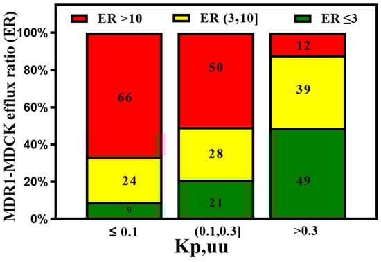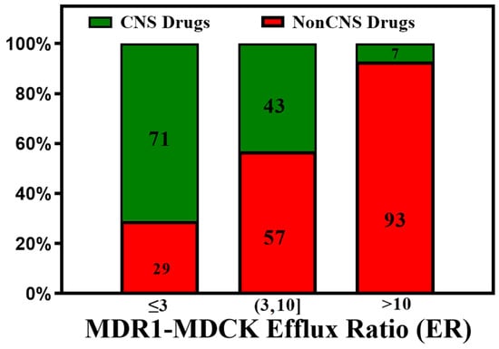 Dolgikh et al. [81] incorporated the P-gp efflux ratio in direct and indirect regression QSAR models for Kp,uu. The performance of the Kp,uu model improved significantly by adding P-gp efflux data (R2 enhanced from 0.39 to 0.53). For understanding the quantitative correlations between the structure of P-gp and the various molecular descriptors, different computational algorithms accompanying structure- and ligand-based approaches [93,94], pharmacophore models [95,96], and machine learning methods [97] have been studied. With the availability of high-throughput P-gp efflux data using MDCK-MDR1 assays, there is an increasing effort to measure the efflux of a large number of compounds experimentally [98]. These data enabled better predictive models for P-gp efflux. Ohashi et al. [99] constructed regression models to predict the value of P-gp-mediated efflux using 2397 data entries with an extensive dataset collected under the same experimental conditions. Most compounds in the test set fell within two- and three-fold errors in the random forest regression model. P-gp transporter efflux data available in the literature have considerable variability, as molecules are tested using different protocols, cell lines, and biological assays [100]. Broccatelli et al. [101] tested a dataset of 187 compounds in the Borst-derived MDCK-MDR1 cell lines to calculate P-gp efflux ratios (ERs). The ER presents the ratio of the apparent permeability from the basolateral to the apical direction (excretory) to the apparent permeability from the apical to the basolateral direction (intake) in an overexpressing P-gp cell line. Molecules with an ER ≥ 2 are typically considered P-gp substrates [102]. Available P-gp efflux data (measured in MDCK-MDR1 cells) for CNS (CNS+) and non-CNS (CNS−) drugs show that most CNS drugs have a P-gp efflux ratio below 10. In cases where brain metabolism and uptake effects are negligible, it has been shown that compounds with higher efflux generally have lower Kp,uu values. (See Figure 5). As CNS distribution of a compound does not depend only on P-gp efflux, a significant percentage of compounds with lower efflux do not distribute into the CNS, and a good percentage of compounds with higher efflux distribute into the CNS. It is important to note that the analysis involves a small number of drugs (128 CNS+ and 39 CNS−) that have MDR1-MDCK efflux data and provide qualitative guidance to utilize efflux data for selecting CNS-penetrant compounds.