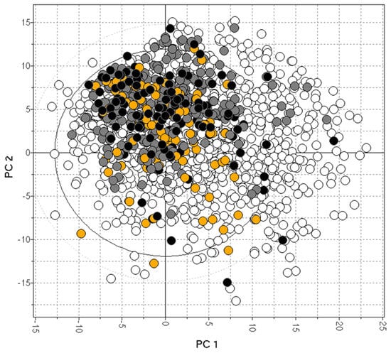 The bias of available drugs with MDCK (orange) and Kp,uu data (black). The grey and white dots represent CNS+ and CNS- compounds, respectively.