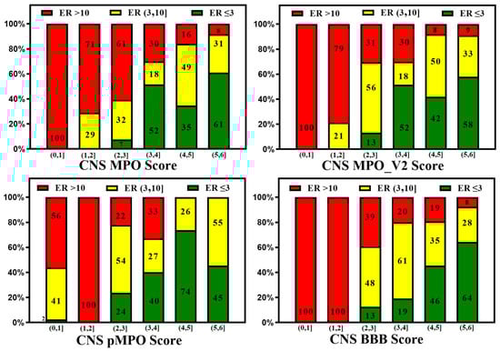 A reliable in silico prediction method for CNS penetration can provide several advantages for discovering small-molecule drugs for neurological diseases but only if prediction results correlate with in vitro and in vivo measurements. Various CNS scoring schemes are fast and easy to apply to screen libraries at the exploratory stage of drug discovery; these scores correlate to some extent with in vitro efflux and animal Kp,uu, as illustrated by Figure 7 and Figure 8, which plot the relative distribution of CNS and non-CNS drugs based on the P-gp efflux ratio and rat Kp,uu corresponding to different CNS scoring schemes (CNS MPO, MPO_V2, pMPO, and BBB Score). Ideally, CNS drugs, i.e., the range of scores (4,6], should be more populated with drugs having an ER ≤ 3, and non-CNS drugs should be heavily populated in the lower ranges of scores, i.e., (0,4]. It is encouraging to see in Figure 7 that all scoring methods segregate the drugs with lower ER towards a higher score range (4,6], and the drugs with higher ER towards a lower range (0,3}, but the segregation is not perfect. There is a lot of room for improvement. Figure 8 presents 100% stacked bar graphs for low-to-high MPO, MPO_V2, pMPO, and BBB Scores for the rat Kp,uu dataset. Ideally, any molecule with an MPO, MPO_V2, pMPO, and BBB Score in the range of (4,6] should correspond to a CNS drug. Most CNS drugs have Kp,uu in a moderate range (i.e., Kp,uu of (0.1,0.3] or <0.3). Ideally, the in silico scores plotted in Figure 8 could be interpreted as the probability of a molecule attaining a score between 4 and 6 to have decent Kp,uu. MPO and MPO_V2 predict 33% and 32% of drugs to have a Kp,uu > 0.3, respectively, in the range (5,6], which is very low compared to the 62% and 68% predicted by the pMPO and BBB Score, respectively. For MPO_V2 and pMPO, drugs in the range (3,4] have poor predictability (nearly 50%) in differentiating between high and low Kp,uu exposure. The MPO and BBB Score predict that 69% and 61% of drugs that score in the (3,4] range have a Kp,uu ≤ 0.1, which is an improvement over the MPO_V2 and pMPO scores.