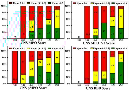 100% stacked bar graphs for low-to-high MPO, MPO_V2, pMPO, and BBB Scores for rat Kp,uu dataset. Compounds with a higher score tend to show higher unbound brain exposure.