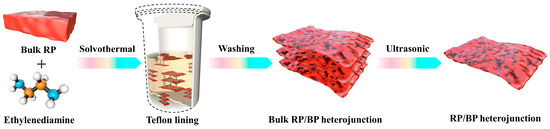 The RP/BP heterojunction is prepared by solvothermal and ultrasonic methods. As shown in Figure 1, the preparation process includes the phase transition of the bulk RP by solvothermal treatment, the purification process of the bulk RP/BP heterojunction by centrifugal treatment, and the exfoliation process of the bulk RP/BP heterojunction by ultrasonic treatment. Under high temperature and pressure conditions, bulk red phosphorus is intercalated and activated by ethylenediamine to produce phase transition [31]. Other solvents, such as water and ethanol, cannot induce phase transition of bulk red phosphorus under the same high temperature and pressure conditions [31]. The bulk RP/BP heterojunction obtained from solvothermal treatment is black in color. Through ultrasonic treatment, the bulk RP/BP heterojunction transforms into a layered-structured RP/BP heterojunction, and the color of the sample transforms into yellow.