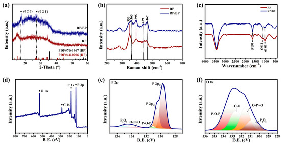 Spectroscopic characterization of the RP/BP heterojunction and bulk RP. (a) XRD spectra; (b) Raman spectra; (c) FT−IR spectra; (d) XPS survey spectrum; High-resolution XPS spectra of (e) P 2p and (f) O 1s.