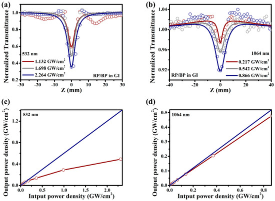 Nonlinear absorption performance of the RP/BP heterojunction in GI. Open aperture Z−scan spectra at different waist power densities under (a) 532 nm and (b) 1064 nm; Laser transmittance spectra converted from open aperture Z−scan spectra under (c) 532 nm (2.264 GW/cm2) and (d) 1064 nm (0.866 GW/cm2).