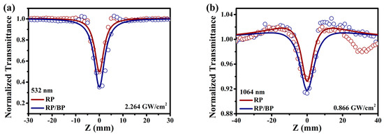Comparison of nonlinear absorption performance between the RP/BP heterojunction and the RP in GI. Open aperture Z−scan spectra under (a) 532 nm and (b) 1064 nm.