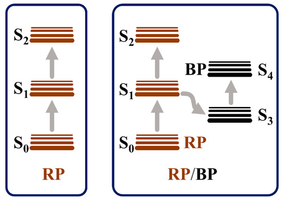 The RP/BP heterojunction exhibits better NLO performance than the bulk RP, whether at 532 or 1064 nm. At the same laser power density (2.264 GW/cm2), the modulation depth of the RP/BP heterojunction at 532 nm is 0.65, while the modulation depth of the bulk RP is 0.50 (Figure 7a). At the same laser power density (0.866 GW/cm2), the modulation depth of the RP/BP heterojunction at 1064 nm is 0.08, while the modulation depth of the bulk RP is 0.07 (Figure 7b). Compared with the bulk RP, the modulation depths of the RP/BP heterojunction increase by 28.8% and 32.6% at 532 and 1064 nm, respectively. The reverse saturable absorption of the RP without the introduction of BP is weaker than that of the RP/BP heterojunction with the introduction of BP. As shown in Figure 8, the energy level of the bulk RP follows a three-level model. It is determined that the reverse saturable absorption of bulk RP is not two-photon absorption. As shown in Figure 7b, if it is two-photon absorption, a slightly upward signal cannot occur. Only when the excited state absorption cross-section is larger than that of the ground state absorption will the reverse saturable absorption of the bulk RP arise. The energy level of the RP/BP heterojunction follows a five-level model [26]. In contrast to the bulk RP, the charge transfer occurs in the RP/BP heterojunction due to the introduction of the BP phase [26]. Because of the larger absorption cross-section of BP and longer carrier relaxation time, the excited state absorption of the RP/BP heterojunction is enhanced. Therefore, its reverse saturable absorption performance is stronger.