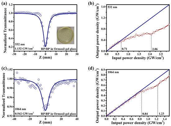 OL performance of the RP/BP heterojunction doped ormosil gel glass. Open aperture Z−scan spectra under (a) 532 nm (with the optical image of the RP/BP heterojunction doped silicone gel glass in the inset) and (c) 1064 nm; Laser transmittance spectra under (b) 532 nm and (d) 1064 nm.