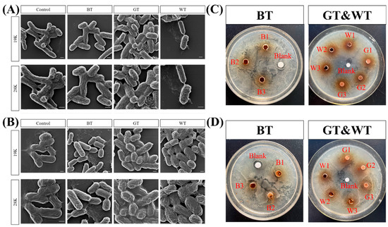 Effects of three alcoholic extracts of tea on surface morphological changes of bacteria. (A) Morphological effects of three tea extracts on E. coli. (B) Morphological effects of three tea extracts on S. aureus. (C) Antibacterial effect of three TEs on E. coli. In GT&WT, the upper left is WT, and the lower right is GT. (D) Antibacterial effect of three tea extracts on Staphylococcus aureus. In GT&WT, WT is at the lower left and GT is at the upper right. Scale bar: 500 nm.