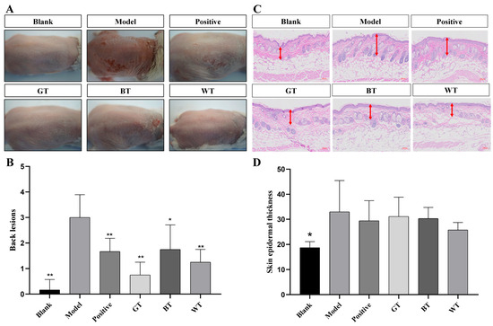 The PASI score is often used to assess the severity of psoriasis. As shown in Figure 2A,B, for the therapeutic effect of modeling mice, WT, GT and Positive groups showed the best significant effect (p < 0.01), while black tea group had good effect (p < 0.05). The histological analysis of the tested skin was shown in Figure 2C,D. The epidermal hyperplasia of the positive group, all tea extract groups and blank group was lower than that of the model group, indicating that the local application of the three TEs could effectively inhibit the epidermal hyperplasia caused by allergic dermatitis. The WT extract group showed better inhibitory effect.