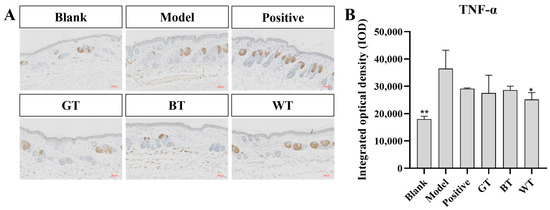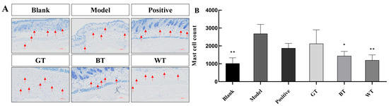 As shown in Figure 3, the number of mast cells in the dermis in the blank group was significantly reduced compared to the model group. In the drug group, the degree of mast cell infiltration in mice treated with extracts of WT and BT was significantly lower than in the model group, and the degree of mast cell infiltration was lowest in the skin tissues of mice treated with WT extract. This suggests that WT extract inhibits psoriasis-induced skin inflammation.