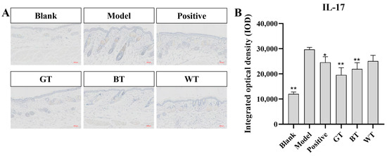 As shown in Figure 4, compared with model group, the expression of pro-inflammatory cytokine IL-17 in blank group was significantly increased (p < 0.01), and the expression of IL-17 in BT extract group and GT extract group was significantly decreased compared with model group (p < 0.01). The positive group could inhibit the expression of IL-17 (p < 0.05).