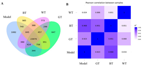 Pearson correlation coefficient (R) was selected as the evaluation index of biological repeat correlation in this paper. The closer the absolute value of R is to 1, the stronger the correlation between the two duplicate samples, and this is the key criterion. In Figure 6A, a total of 23,979 co-expressed genes were analyzed, and the most co-expressed genes were found in the BT group and the model group among the treatment groups. This was also demonstrated in Figure 6B, with the highest R2 value of 0.968 for the BT group versus the model group.