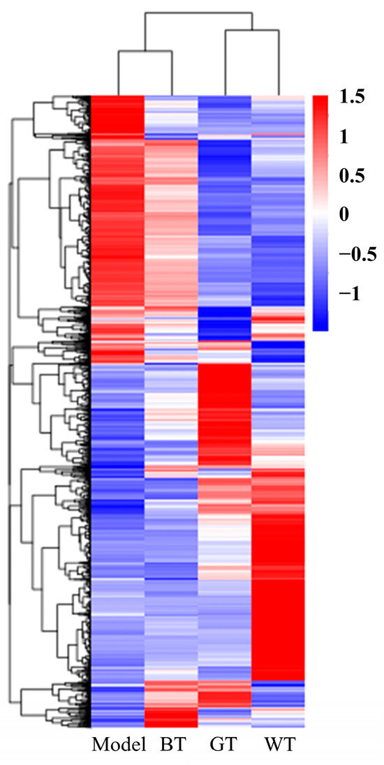 The total number of genes detected in differential groupings and the number of significantly up- and down-regulated differential genes are shown by volcano plots. Fold change in gene expression is represented as the volcano plot horizontal axis, and gene significance levels are represented as the vertical axis. Up-regulated differentially expressed genes are represented by red dots, down-regulated differentially expressed genes are represented by green dots, and non-differentially expressed genes are represented by blue dots. As can be seen from Figure 8, the GT group had the most up- and down-regulated genes compared to the model group, and the WT group also had significant down-regulated genes.