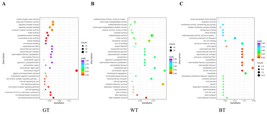 Genetic ontological functions of (A) model vs. GT group, (B) model vs. WT group, and (C) model vs. BT group.