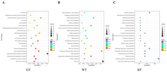 KEGG enrichment in (A) model vs. GT group, (B) model vs. WT group, and (C) model vs. BT group.