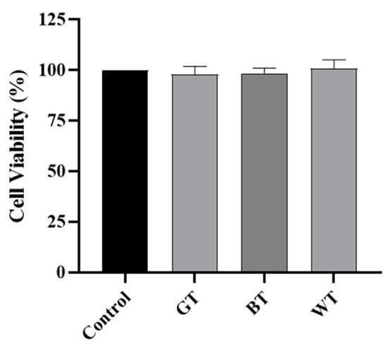 As shown in Figure 12, compared with the control group, the cell vitality of the three tea extracts after treatment was almost at the same level, indicating that the three tea extracts were not cytotoxic and could be used for treatment.
