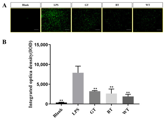 Effects of extracts on the release of RAW264.7 ROS in macrophages. Data plotted as mean ± standard deviation. (A) Photographed cell fluorescence images. (B) Results of optical density measurements. Compared with the LPS group, ** p < 0.01. Scale bar: 200 nm.