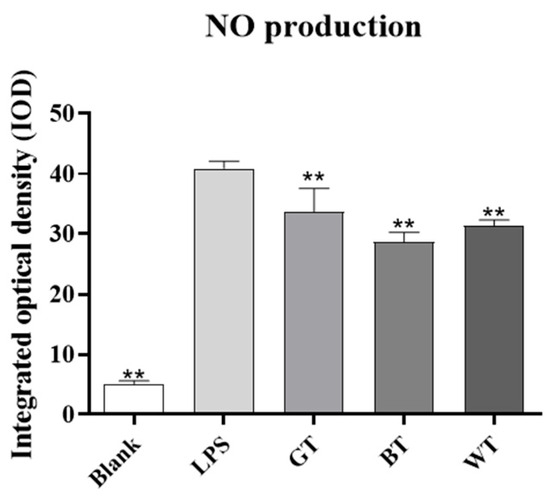 Effects of extracts on the release of RAW264.7 NO in macrophages. Data plotted as mean ± standard deviation. Compared with the LPS group, ** p < 0.01.