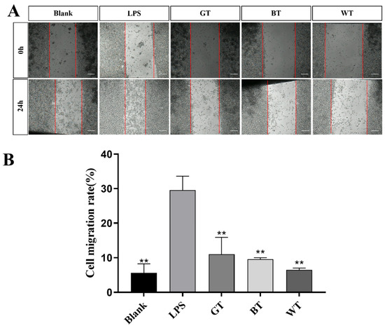 (A) Cell migration and (B) cell mobility of three tea extracts. Data plotted as mean ± standard deviation. The red line shows the outline of the scratch. Compared with the LPS group, ** p < 0.01. Scale bar: 200 μm.