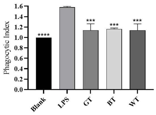 Phagocytosis index of three tea extracts. Data plotted as mean ± standard deviation. Compared with the LPS group, *** p < 0.001, **** p < 0.0001.